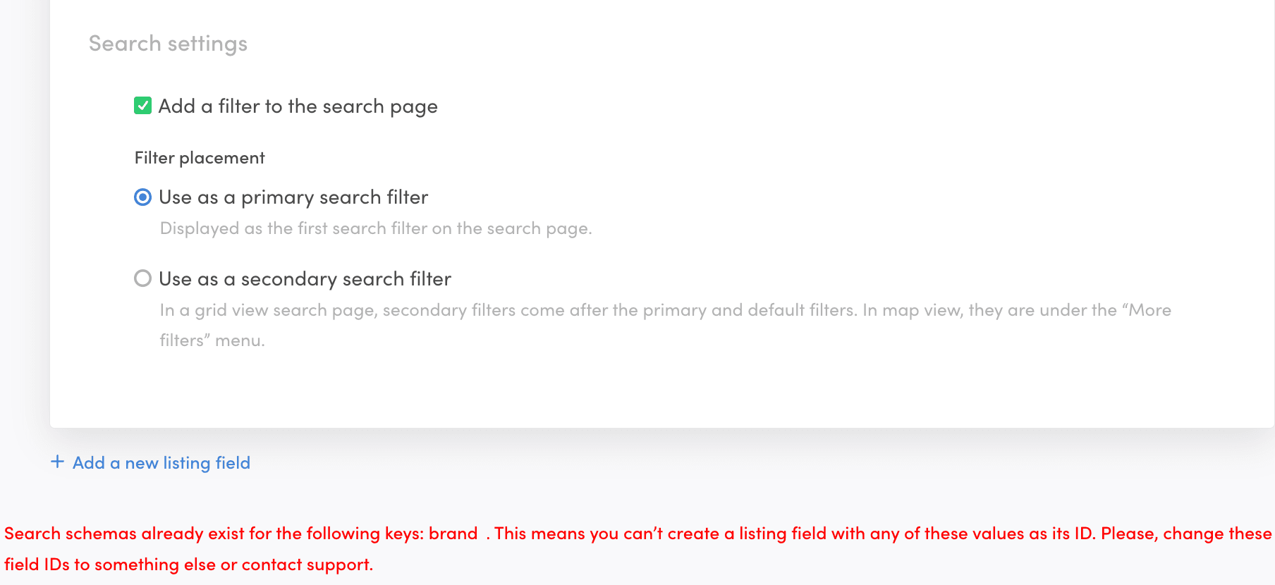 If you then try to add a search schema through Sharetribe CLI for a key and scope that already exists in a Console-originated listing field, you will see the following error: