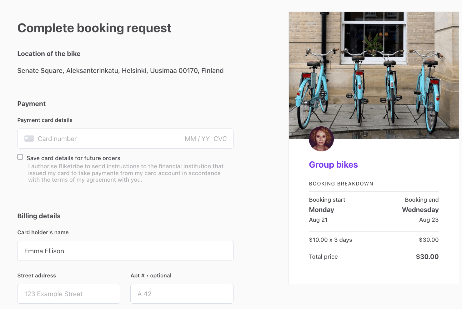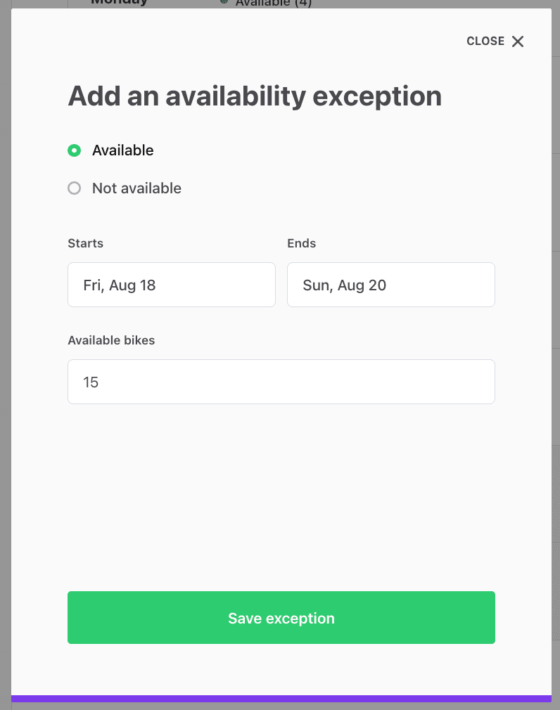 On our imaginary bike rental marketplace, some providers may have several similar bikes to rent. Instead of needing to create separate listings for each similar bike, we can add “seats” to a single listing. This makes it possible for customers to book several similar bikes in one go for the same time period.