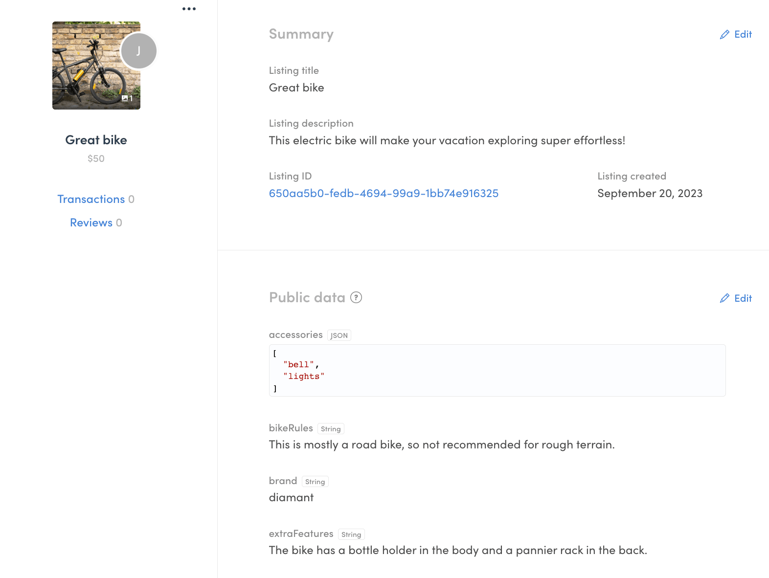 When you now view the bike in your Sharetribe Console > Manage > Listings, you can see the extra features get saved in the listing's public data.
