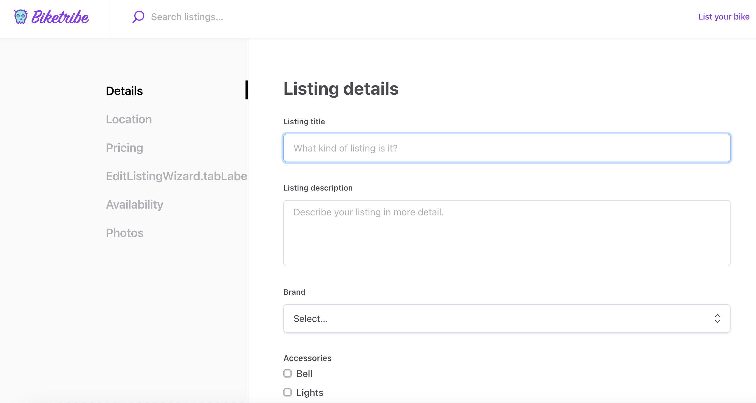 return false;Now, if you start creating a new listing, you’ll see a new tab label in the left side navigation. However, the label only shows the relevant marketplace text key, since we have not yet added the marketplace texts in Sharetribe Console.